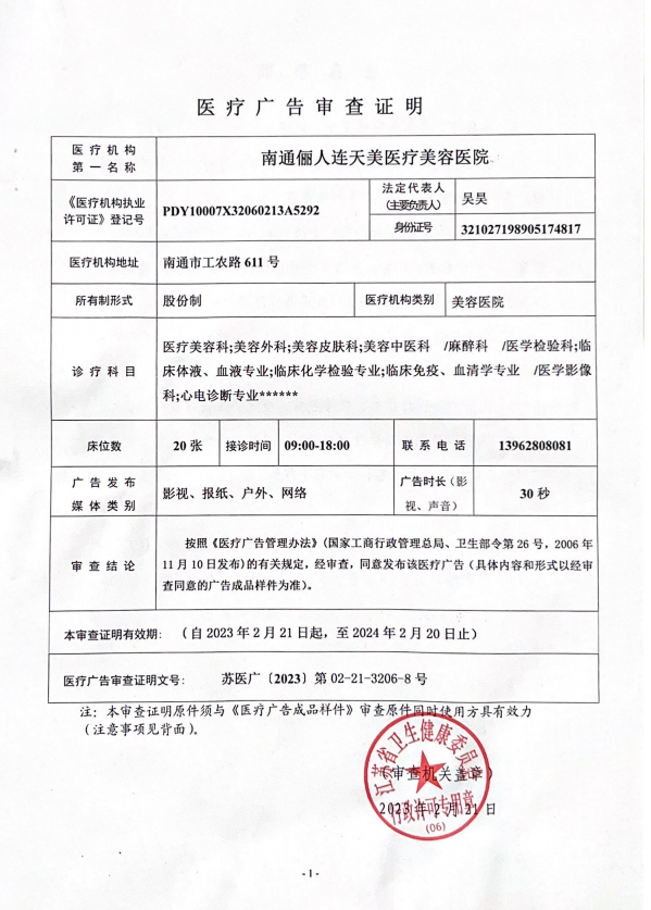 南通儷人連天美醫(yī)療美容醫(yī)院是與著名的醫(yī)療美容集團合作建立的醫(yī)院,醫(yī)院提供高品質的醫(yī)療美容服務。2008年,南通儷人連天美醫(yī)療美容醫(yī)院落戶南通,成為由南通衛(wèi)生局審批的專業(yè)醫(yī)療美容醫(yī)院。南通儷人連天美醫(yī)療美容醫(yī)院,特別設有專業(yè)的整形美容科、皮膚美容科和微創(chuàng)美容科三大科室,致力于為廣大求美者提供全方位的醫(yī)療美容服務。南通儷人連天美醫(yī)療美容醫(yī)院為求美者建立個人終生美麗檔案,一對一進行細致服務。 11年來,南通儷人連天美醫(yī)療美容醫(yī)院,不斷引進先進設備,不斷完善醫(yī)美技術,一批優(yōu)秀、專業(yè)而穩(wěn)定的醫(yī)生團隊,為無數求美者鑄就美麗夢想。